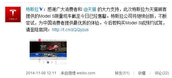 11月8日,特斯拉公司午间发布微博称,特斯拉为天猫顾客提供的Model S限量现车截至已经售罄,今后消费者若需购买Model S或预约试驾,需登录特斯拉官方网站。目前,天猫特斯拉旗舰店已关闭,所有车型信息均已下线,此前已交付定金的用户,特斯拉会继续为其服务直至整个服务完成。