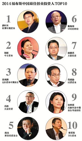 12月29日,福布斯中文版发布的2014年中国最佳创投人榜单显示,软银中国资本执行主管合伙人薛村禾名列第一,今日资本总裁徐新列次席,之前连续多年蝉联榜首的红杉资本中国基金的创始及执行合伙人沈南鹏位居第三。